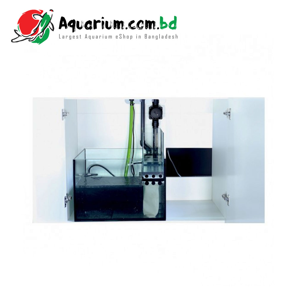The sump includes a filter sock holder and sock to keep large pieces of debris and detritus from clogging pumps and other pieces of equipment. The water can then flow from the filter sock into the skimmer compartment where the water will keep a steady level to aid in the best performance in your choice of skimmer or any other filtration components that you choose to include can be placed there. The water will then flow through the final bubble trap and into the final chamber where the return pump (not included) can be placed to pump water back through the Reefer tanks return plumbing.